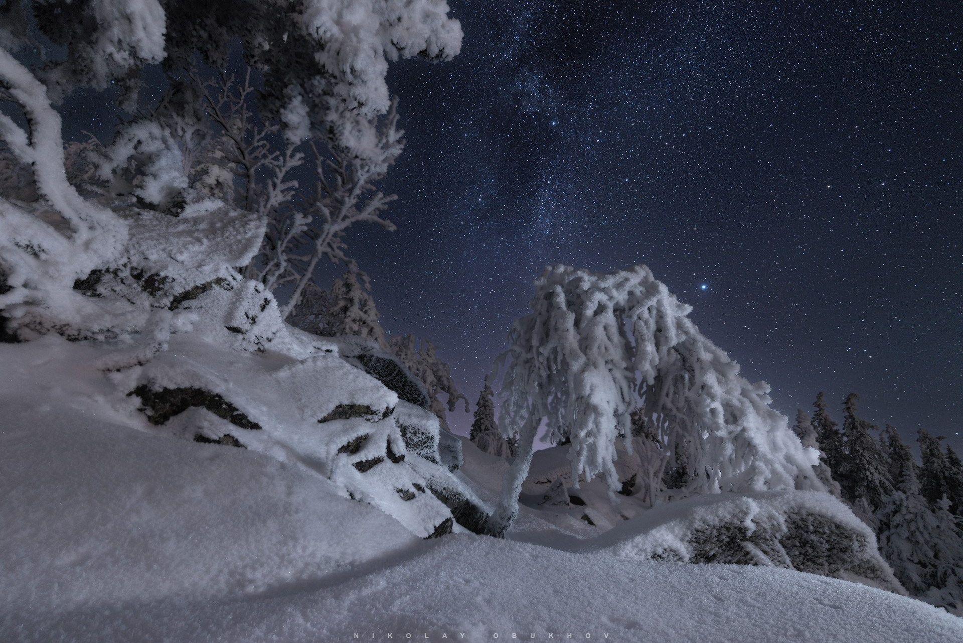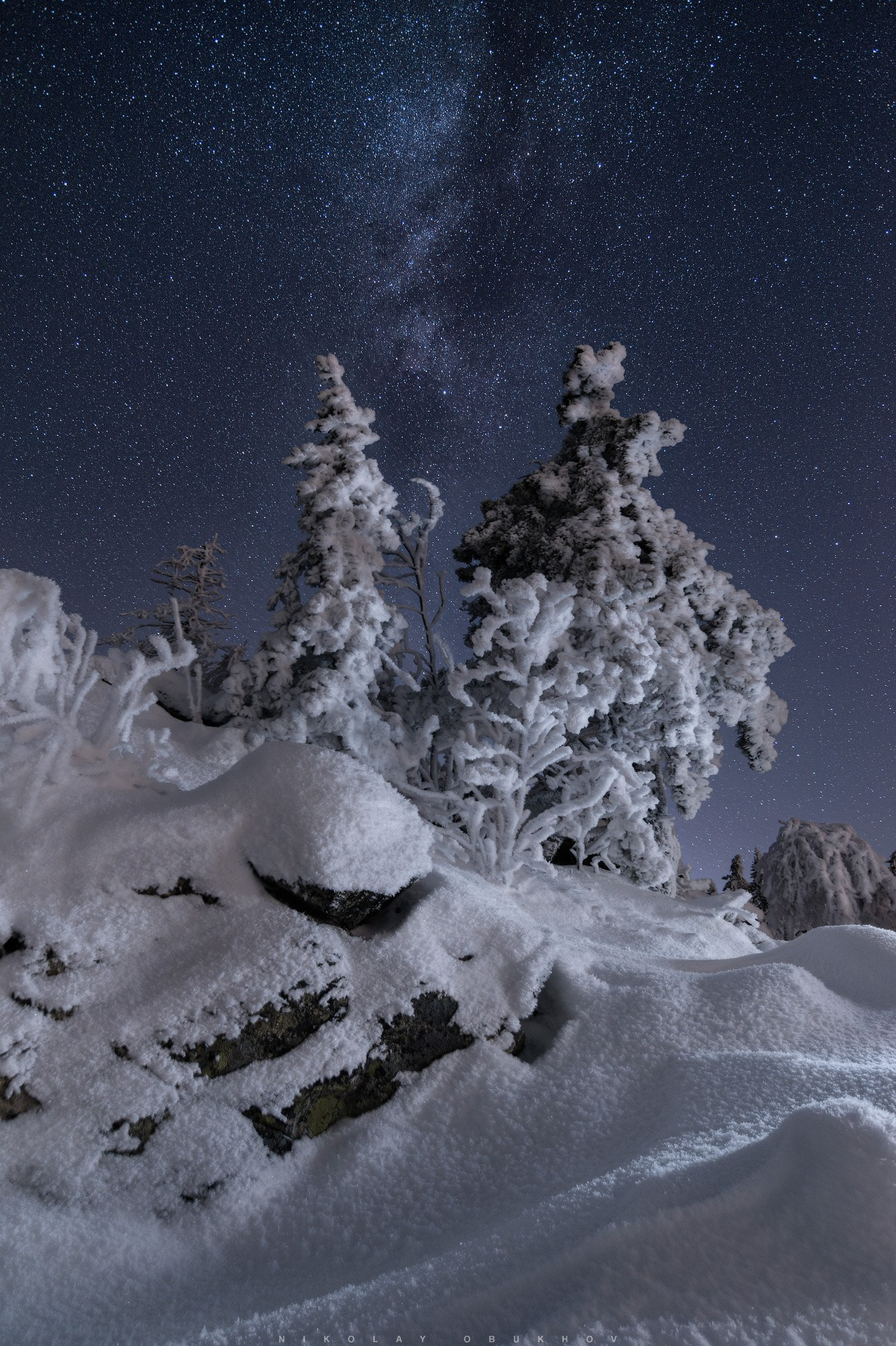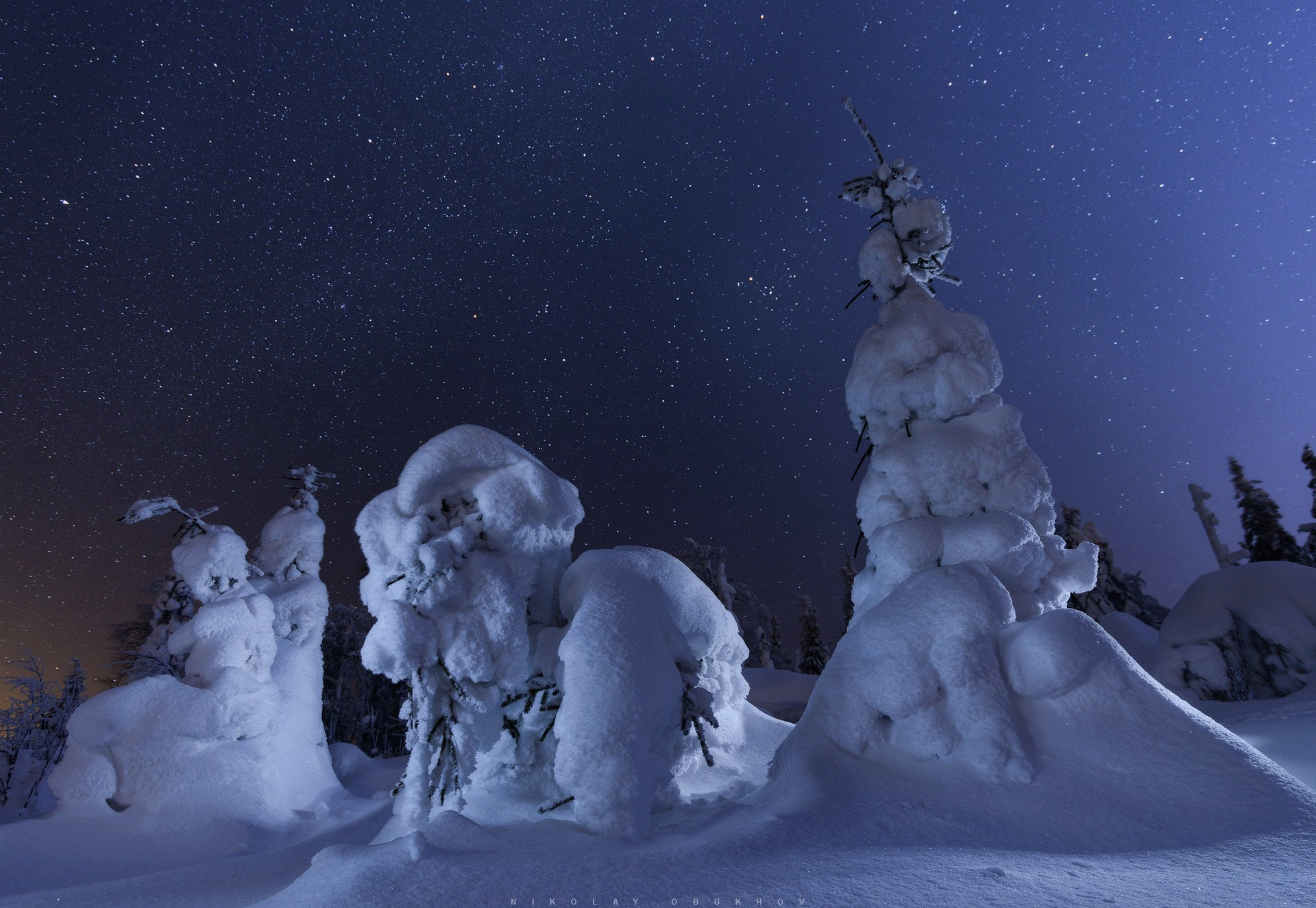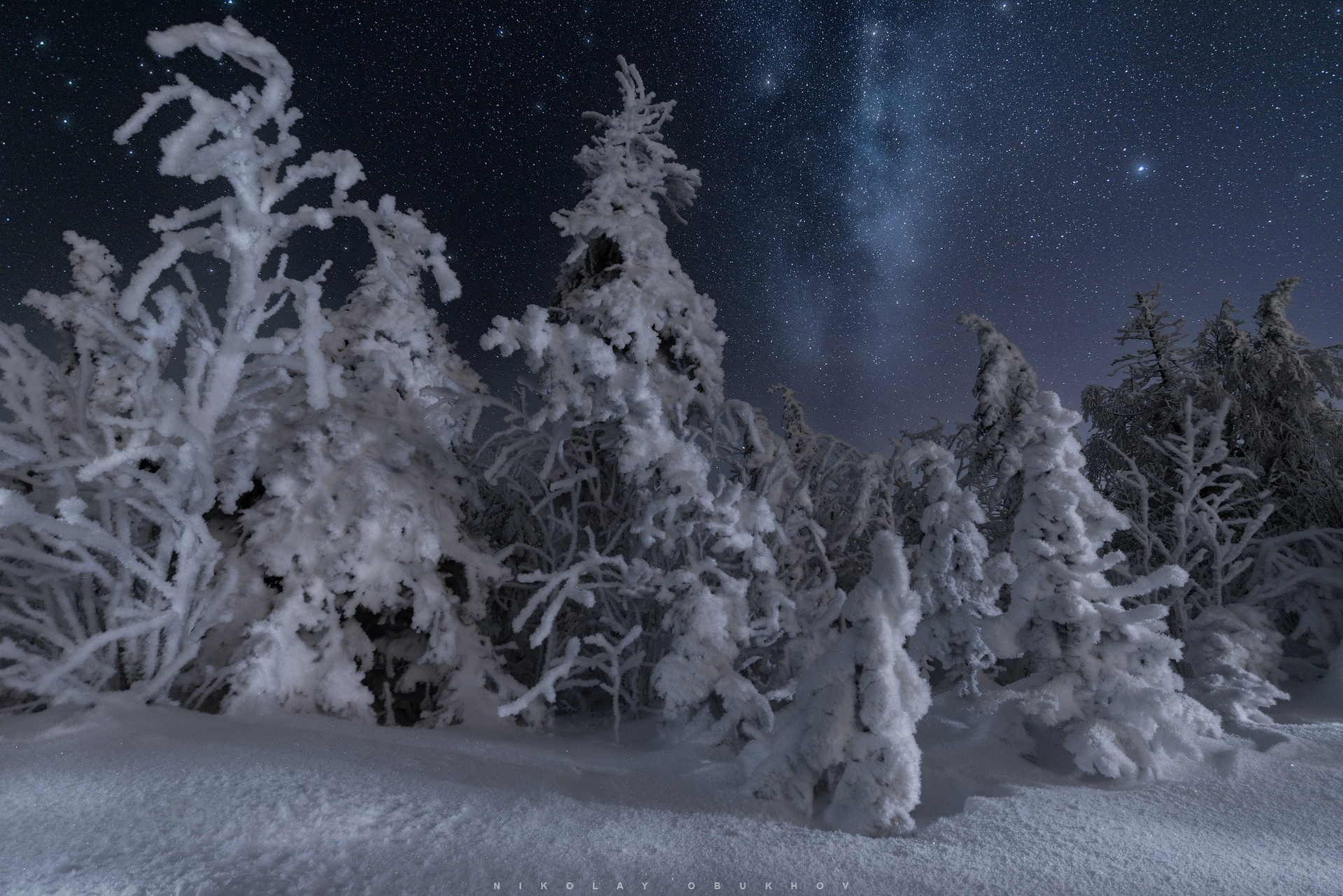 Иногда в ночном небе появляются яркие звёздные россыпи, и тогда пейзаж превращается в настоящую картину. Снег отражает небесный свет, зимний лес под звездами приобретает мягкие голубоватые оттенки, а мороз усиливает ощущение свежести. Фотографы отмечают, что ночные кадры горы Белая наполнены особой атмосферой: в них сочетаются тишина, холод и торжественная красота. Именно здесь ночная съёмка зимнего леса с елями и сугробами становится настоящим вдохновением для творческих людей.