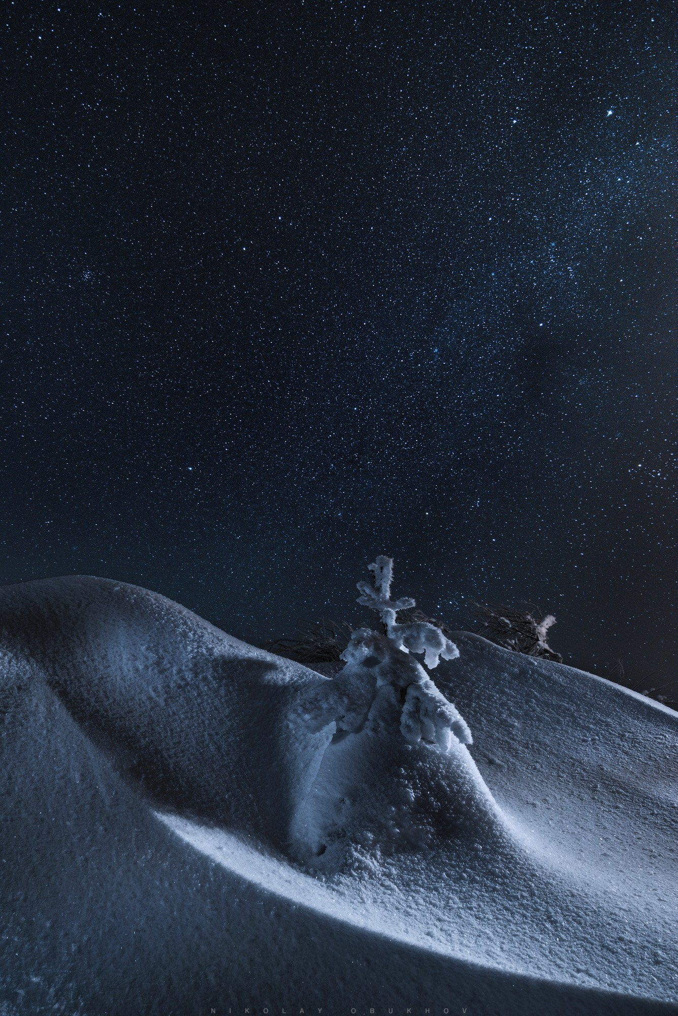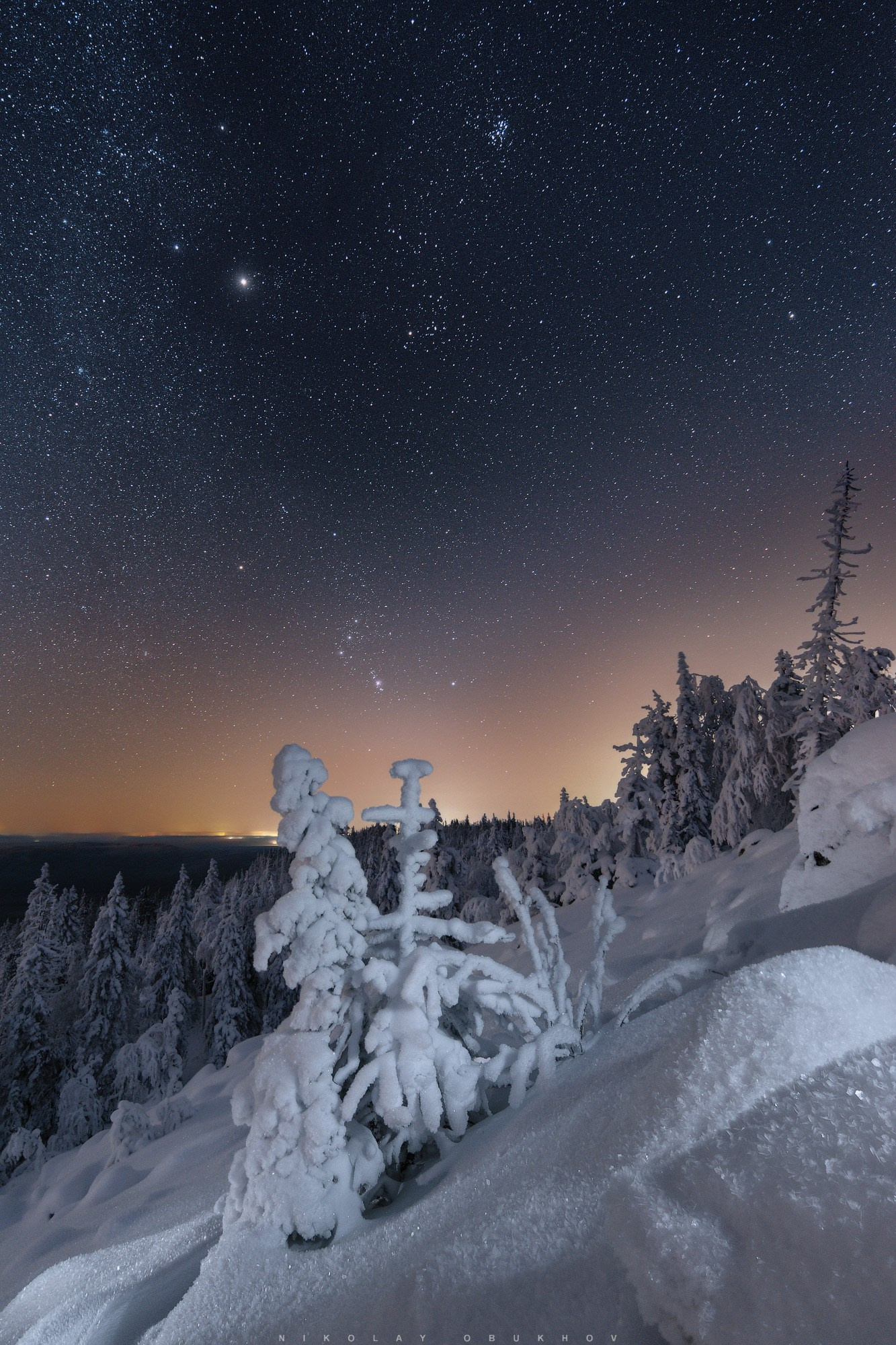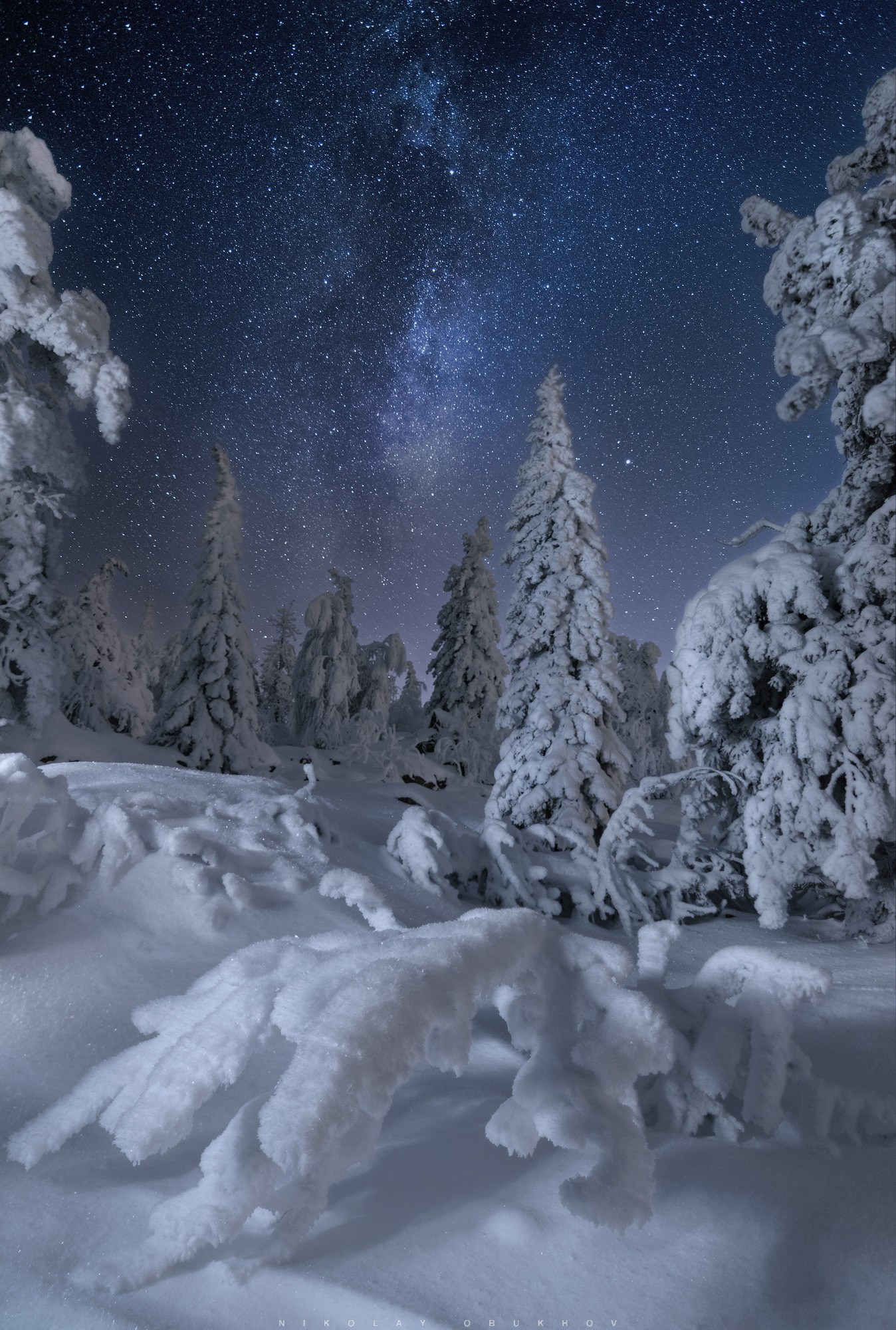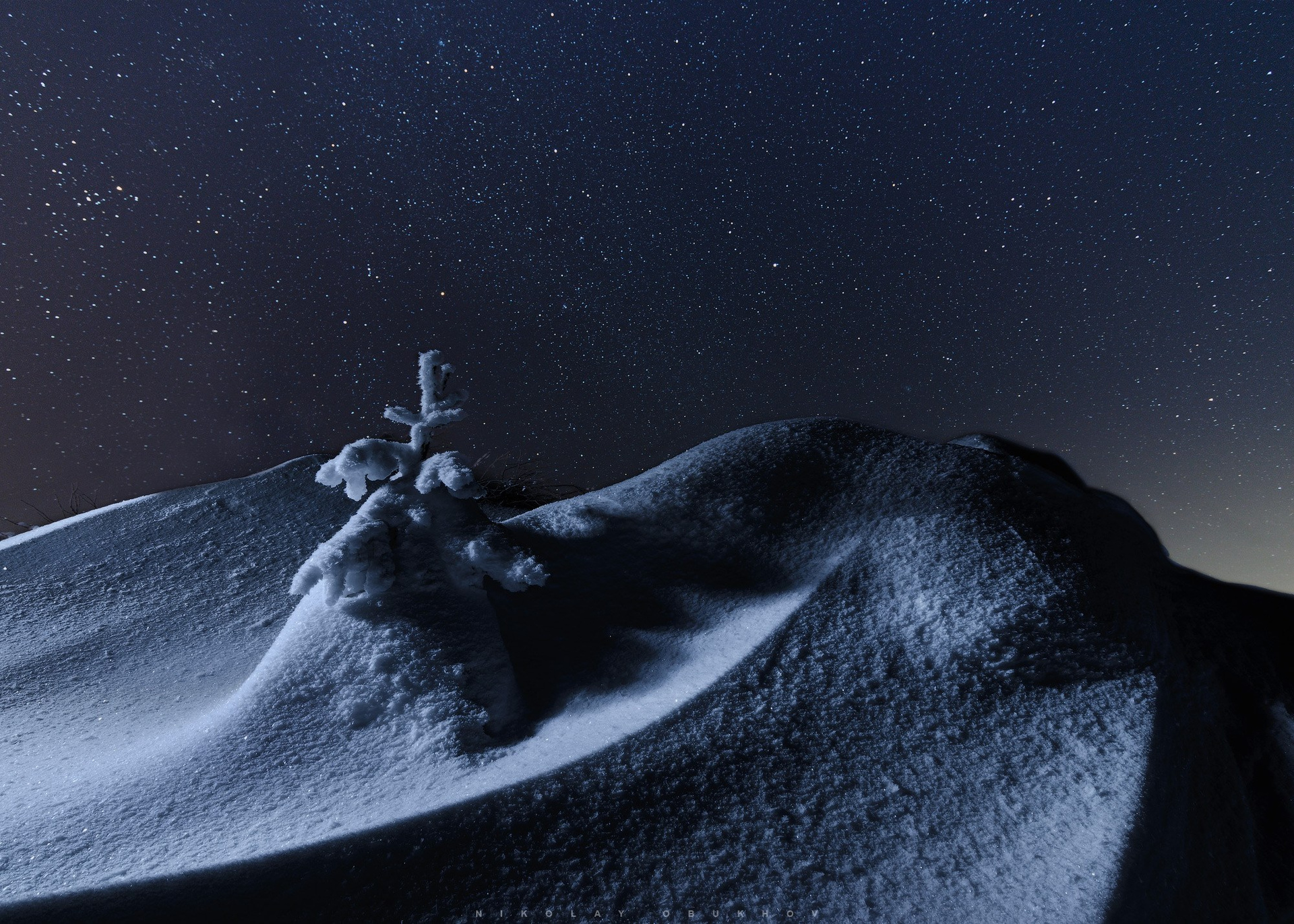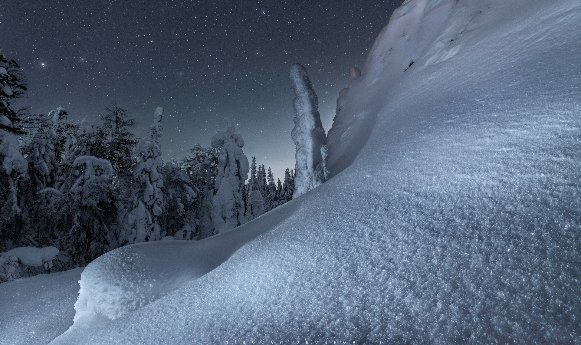 Иногда в ночном небе появляются яркие звёздные россыпи, и тогда пейзаж превращается в настоящую картину. Снег отражает небесный свет, зимний лес под звездами приобретает мягкие голубоватые оттенки, а мороз усиливает ощущение свежести. Фотографы отмечают, что ночные кадры горы Белая наполнены особой атмосферой: в них сочетаются тишина, холод и торжественная красота. Именно здесь ночная съёмка зимнего леса с елями и сугробами становится настоящим вдохновением для творческих людей.