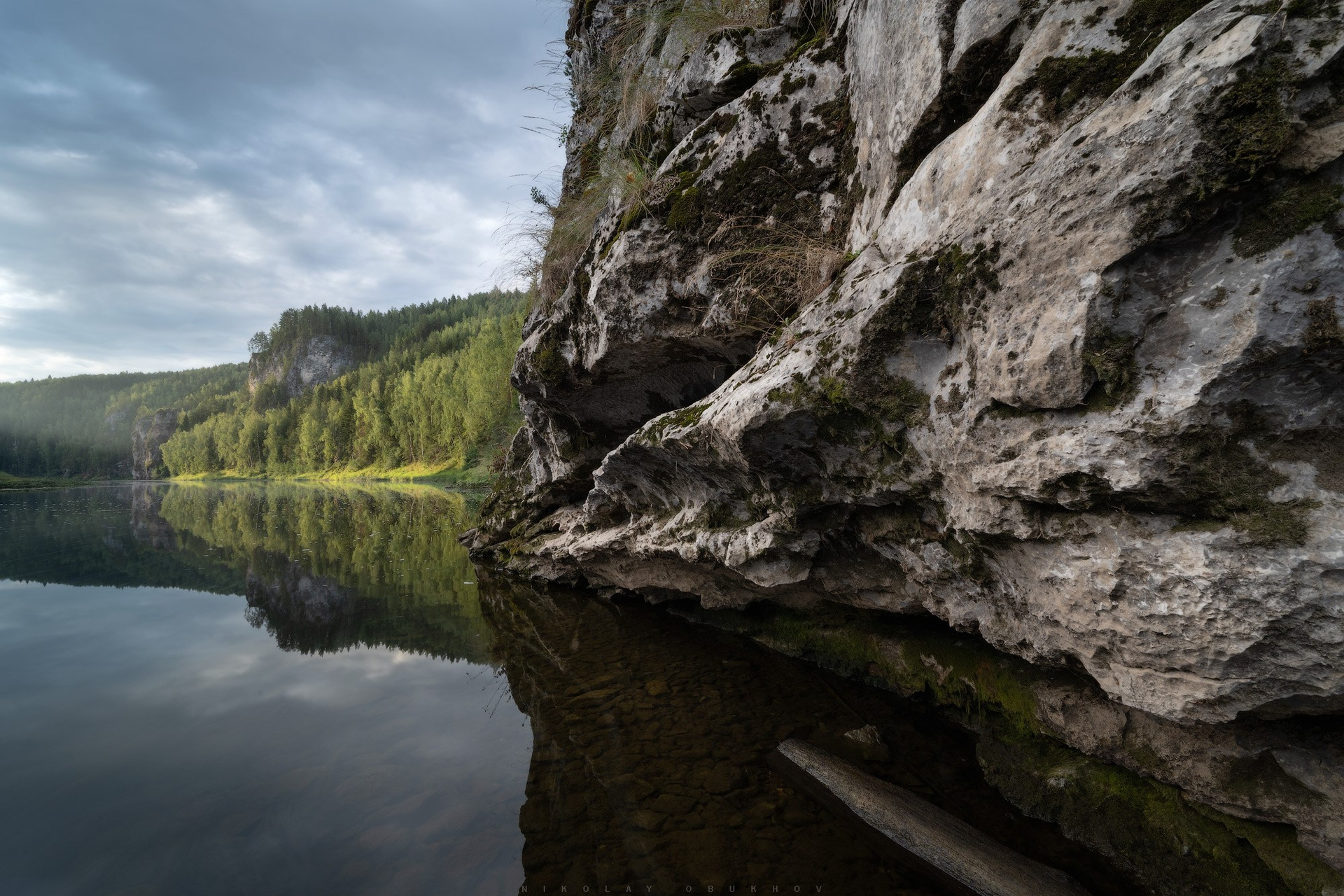 Скалы-бойцы здесь — не просто геологические объекты, а главные персонажи. Их имена известны каждому, кто хоть раз бывал на сплаве: камень Омутной с его мрачной, почти отвесной стеной, Дыроватый Камень с аркой-воротами, скалы Печка, Камень Писаный с демидовским крестом, уникальный Камень Столбы, Камень Разбойник, о который разбились десятки барок из железных караванов в 19 веке... Каждая из скал имеет уникальный силуэт, фактуру и характер. В контексте фотографии они работают как идеальные естественные доминанты. Их вертикаль контрастирует с горизонталью реки, создавая готовую, устойчивую композицию. Скалы задают масштаб. Без них пейзаж был бы просто лесом и водой, с ними он приобретает монументальность и историческую глубину, напоминая о временах, когда по реке шли караваны с демидовским железом.